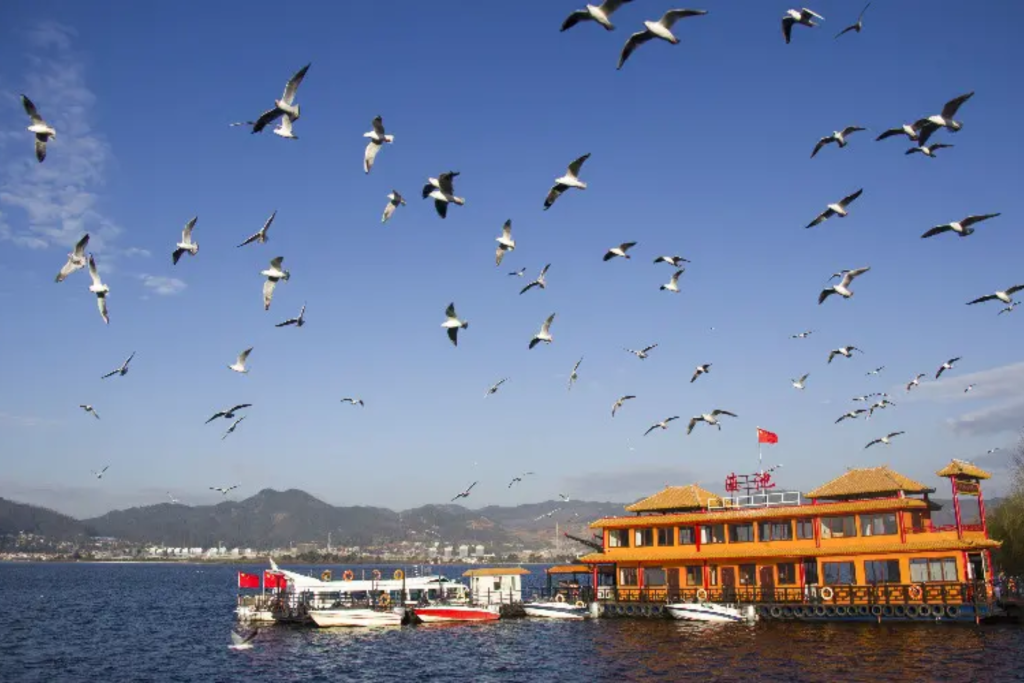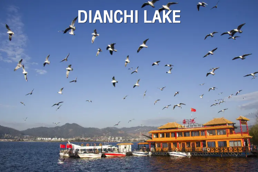 รับบรรยากาศผ่อนคลาย ณ ทะเลสาบเตียนฉือ เสมือน “ไข่มุกแห่งคุนหมิง” ที่โอบล้อมด้วยภูเขาน้อยใหญ่และธรรมชาติอันเขียวขจี ทะเลสาบแห่งนี้มีทัศนียภาพงดงามตลอดปี โดยเฉพาะในช่วงเช้าและเย็นที่แสงแดดสะท้อนผิวน้ำเกิดเป็นเงาสีทองระยิบระยับ นอกจากนี้ยังเป็นจุดที่นักท่องเที่ยวสามารถชมฝูงนกนางนวลหัวดำที่อพยพมาในฤดูหนาว