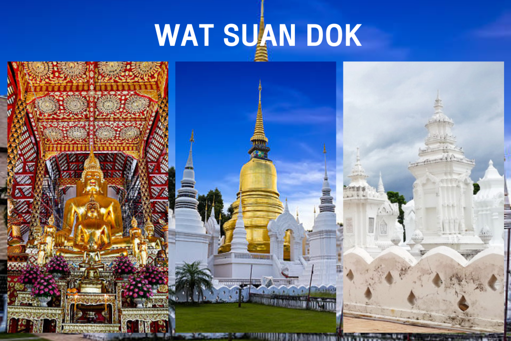 WAT SUAN DOK IS A HISTORIC CHIANG MAI TEMPLE BUILT UNDER KING KUENA. IT’S KNOWN FOR ITS GRAND GOLDEN CHEDI, A COURTYARD OF WHITE STUPAS, AND THE ROYAL ASHES HOUSED THERE. THE TEMPLE ALSO OFFERS A BEAUTIFUL VIEW OF DOI SUTHEP.