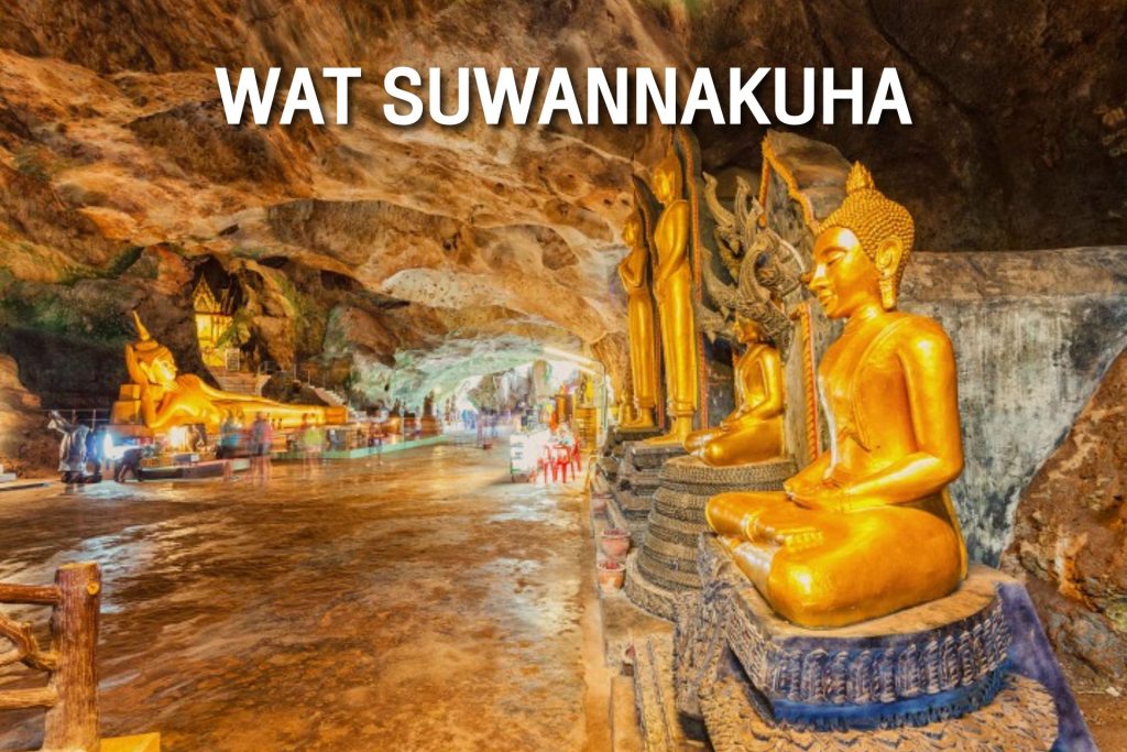 WAT SUWANNAKUHA IS AN ANCIENT TEMPLE OF ARCHAEOLOGICAL AND HISTORICAL IMPORTANCE, LOCATED INSIDE A MOUNTAIN FILLED WITH SEVERAL INTERCONNECTED CAVES. THE MOST SIGNIFICANT IS THE DARK CAVE, WHICH HOUSES A BEAUTIFUL RECLINING BUDDHA IMAGE. OTHER NATURAL CAVES EXTEND DEEPER INTO THE MOUNTAIN, OFFERING STUNNING FORMATIONS. THE TEMPLE ALLOWS VISITORS TO ENJOY BOTH CULTURAL WORSHIP AND NATURAL EXPLORATION IN ONE PLACE.