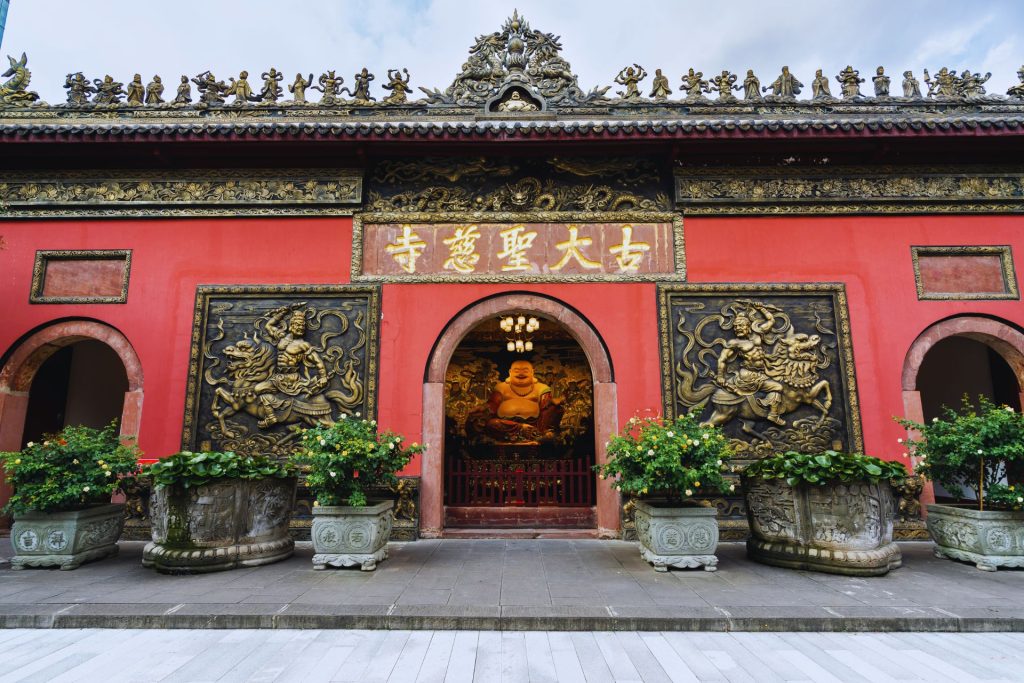 เยือนศูนย์รวมแห่งศรัทธาและความงดงามวัดต้าสือ หรือวัดต้าฉือ(วัดมหาเมตตา)โดยเป็นวัดเก่าแก่ที่มีอายุยาวนานกว่า 1,600 ปี ตั้งอยู่ใจกลางเมืองเฉิงตูมีชื่อเสียงเรื่องความสงบและสถาปัตยกรรมจีนโบราณนักท่องเที่ยวนิยมไปลูบตัวอักษรจีนที่หน้าวัดเพื่อขอพรเรื่องโชคลาภ ความสุข และอายุยืนและเป็นวัดที่พระถังซัมจั๋งบวชเป็นพระภิกษุ ก่อนย้ายไปจำพรรษายังวัดอื่น