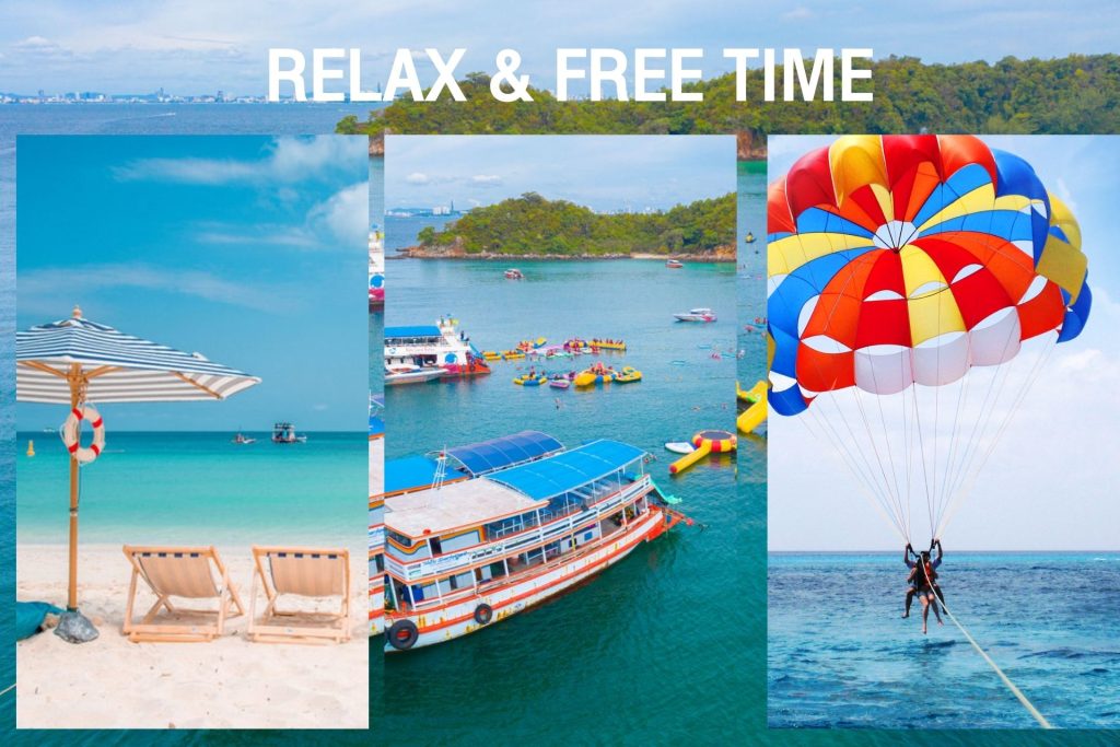 RELAX AND ENJOY ARIOUS ACTIVITIES ON KOH LARN, FROM BEACH STROLLS AND VOLLEYBALL TO SNORKELING AND DIVING AT SPOTS LIKE TAWAEN, THIAN, AND NUAL BEACHES. YOU MAY ALSO TRY KAYAKING, SUP, JET SKIING, OR BANANA BOAT RIDES. SCENIC VIEWPOINTS SUCH AS THE WIND TURBINE POINT AND SAMAE BEACH VIEWPOINT OFFER STUNNING PANORAMIC VIEWS FOR A MEMORABLE ISLAND EXPERIENCE.